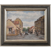 Kaj Molter (A3483) Kaj Molter (1903-1977), olja på duk, signerad, 26 x 34 cm (38 x 46 cm). Gatumotiv från Malmö. Pris 650