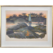 Roland Svensson (A3343) Roland Svensson (1910-2003), litografi, signerad, numrerad 92/360, 30 x 44 cm (46 x 58,5). Verket har titeln ”Blankt sund och natthamn”. Syrafri inramning. Pris 5800