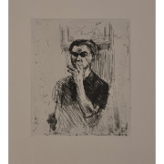 Birger Lundquist (B3369) Birger Lundquist (1910-1952), etsning, signerad och daterad 1958 spegelvänt i trycket, 19,5 x 16 cm, oramad (bladet större). Verket har titeln ”Självporträtt” och är hämtat ur Föreningen För Grafisk Konsts årsmapp 1959. Pris 300