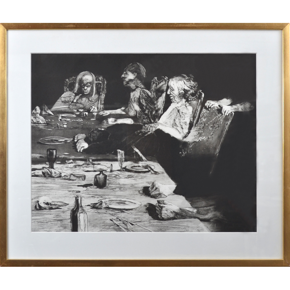 Roj Friberg (1934-), färglitografi, signerad, daterad -84 och numrerad 267/300, 43 x 56 cm (58,5 x 72,5). Verket har titeln "Gästabudet". Litteratur: Ragnar von Holten: Svenska teckningar - 1900-talet, Statens konstmuseer, Stockholm 1985, sidan 164. Syrafri inramning, ram med bruksslitage.