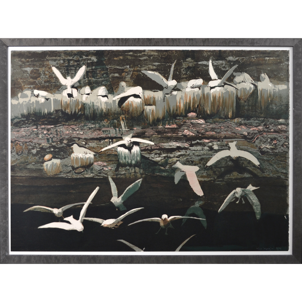 Roj Friberg (A3442) Roj Friberg (1934-), färglitografi, signerad, betitlad ”Krykkjor”, daterad -92, numrerad 75/185, 60 x 88,5 cm (ramen 75,5 x 86). Pris 2400