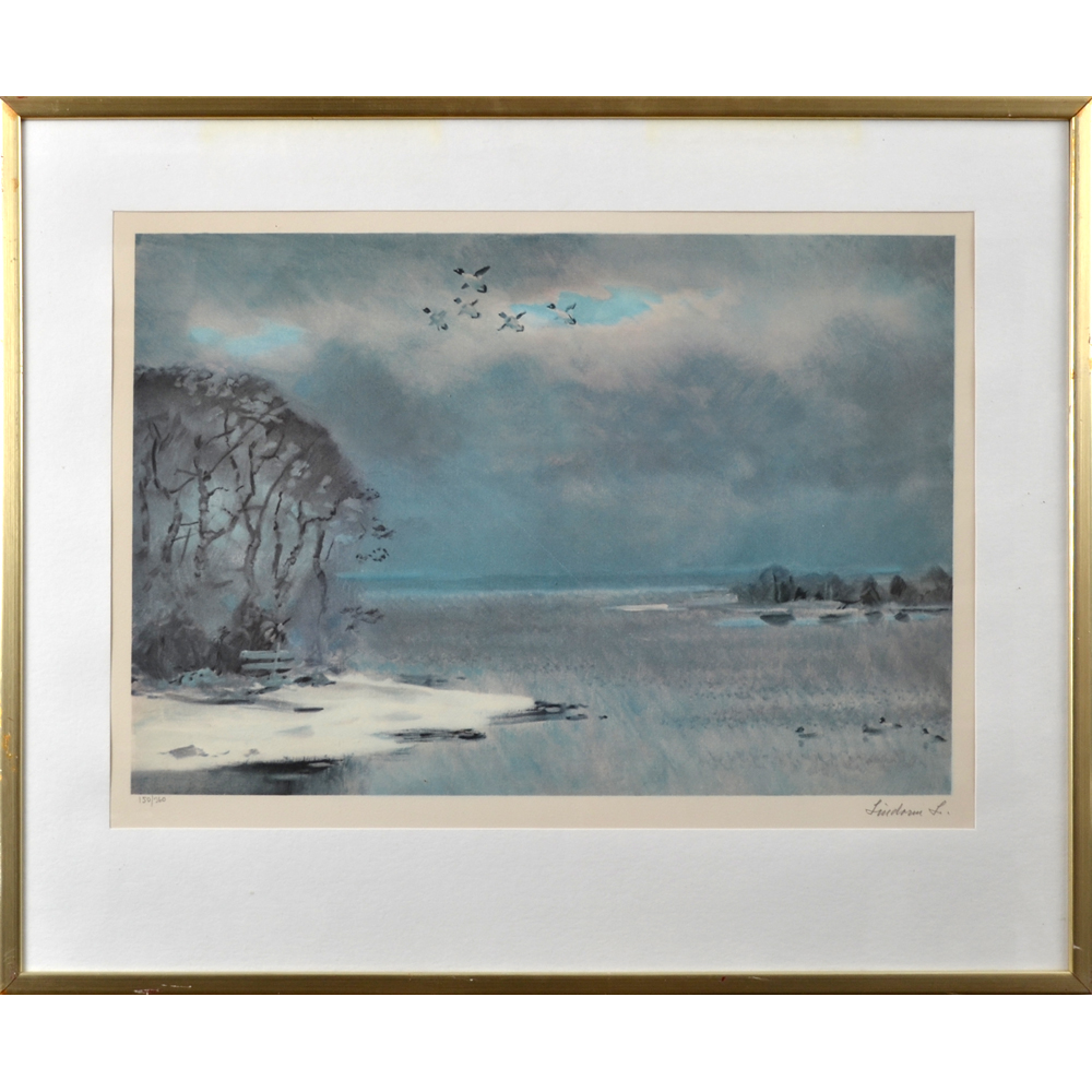 Lindorm Liljefors (1909-1985), litografi, signerad, numrerad 150/360, 41 x 49,5 cm (ramen 59 x 69,5). Verket har titeln "Knipskytt" och ingick som blad nr 3 i mappen "Lindorm Liljefors I" tryckt i 360 exemplar samt HC-upplaga om 40 exemplar och en EA-upplaga om 20 exemplar. Litografierna trycktes hos Atelier Gourdon, Paris under åren 1976-1977. Ramen med bruksslitage och påbättringar.