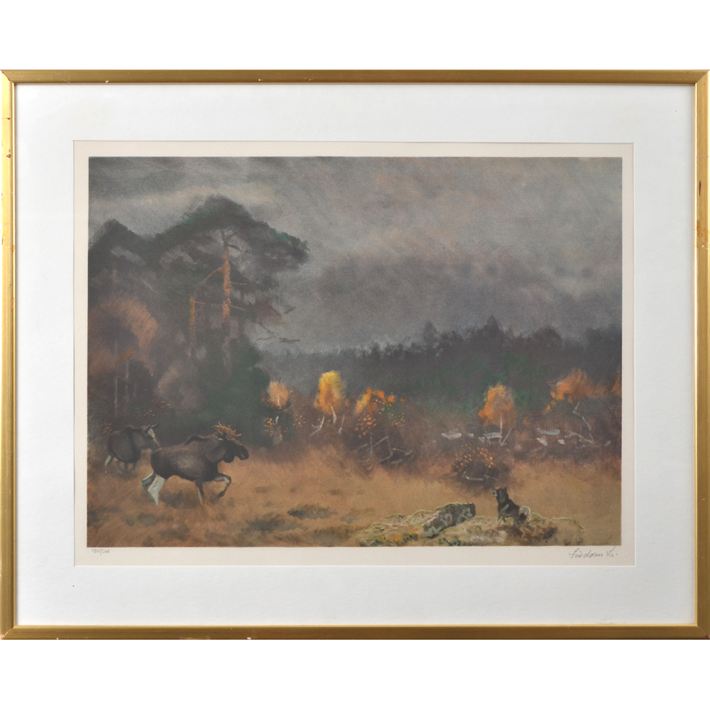 Lindorm Liljefors (1909-1985), litografi, signerad, numrerad 150/360, 41 x 49,5 cm (ramen 59 x 69,5). Verket har titeln "Älgar på ståndet" och ingick som blad nr 4 i mappen "Lindorm Liljefors I" tryckt i 360 exemplar samt HC-upplaga om 40 exemplar och en EA-upplaga om 20 exemplar. Litografierna trycktes hos Atelier Gourdon, Paris under åren 1976-1977. Ramen med bruksslitage och påbättringar.
