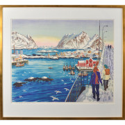 Mona Huss Wallin (A3459) Mona Huss Wallin (1944-), färglitografi, signerad med dedikation, daterad -78, 44,5 x 58 cm (66,5 x 73). Syrafri inramning. Pris 3000
