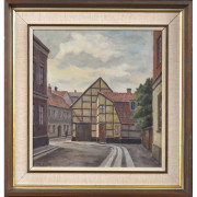 Eduardo ”Eddie” Valenta (A3270) Eduardo ”Eddie” Valenta, olja på pannå, vy över Tomegapsgatan i Lund, vid ”Fickens hörna” och korsningen mot S:t Annegatan, signerad, 26,5 x 25,5 cm (38 x 36,5). Pris 1800