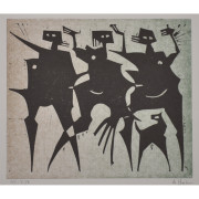 Åke Holm (B2135) Åke Holm (1900-1980), linoleumsnitt, signerad, numrerad 118/250, 16,5 x 19,5 cm. Oramad. Verket har titeln ”Tre gracer” och trycktes 1976. Litteratur: Höganäs Museum nr 167. Pris 150
