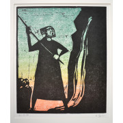 Åke Holm (B2136) Åke Holm (1900-1980), linoleumsnitt, signerad, numrerad 21/250, 20 x 17 cm. Oramad. Verket har titeln ”Moses slår vatten ur klippan” och trycktes 1975. Litteratur: Höganäs Museum nr 165. Pris 150