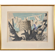 Axel Olson (A2652) Axel Olson (1899-1986), färglitografi, signerad, numrerad 67/260, 33 x 45 cm (64 x 54). Verket har titeln "Hanna och tvättkorgen". Ramnötningar. Pris 900