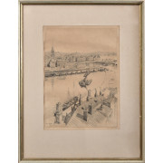 Hans Norsbo (A2650) Hans Norsbo (1897-1955), etsning, signerad, daterad 1950, 35 x 26 cm (56 x 44). Vy över Slussen, Stockholm. Gulnad, åldrad passepartout. Pris 600